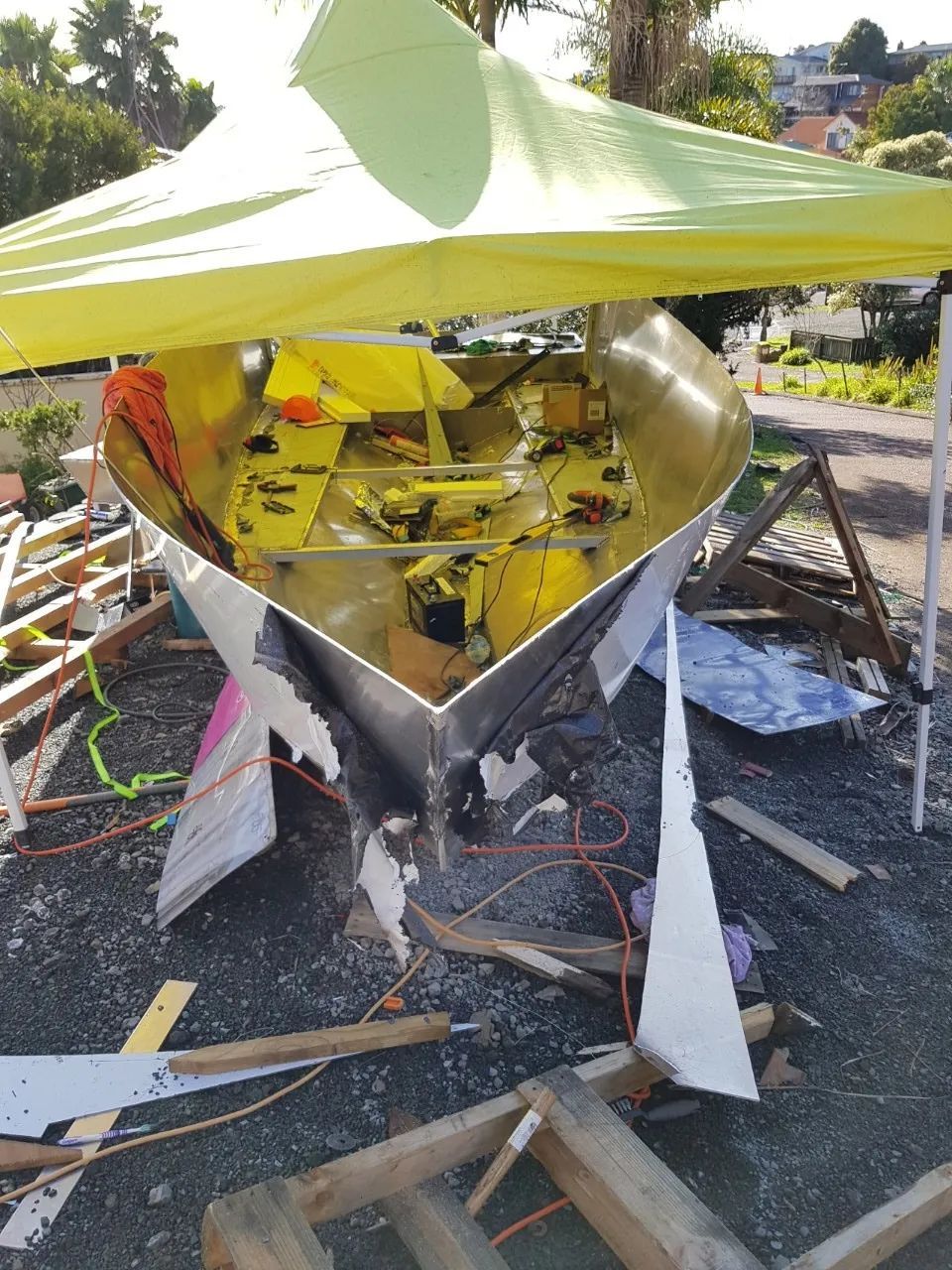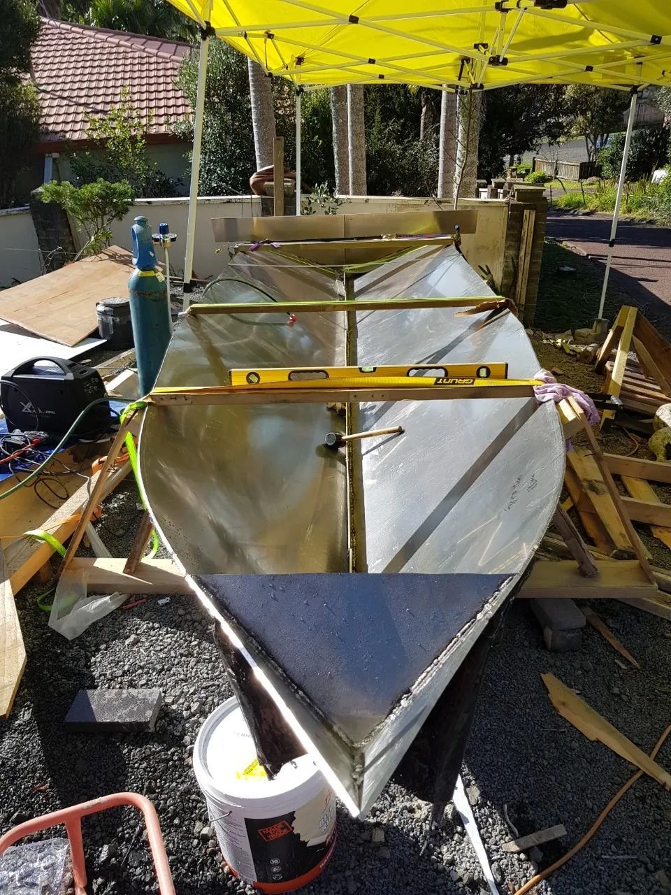 He bought aluminium specially made for boat hulls, and began from the bottom.