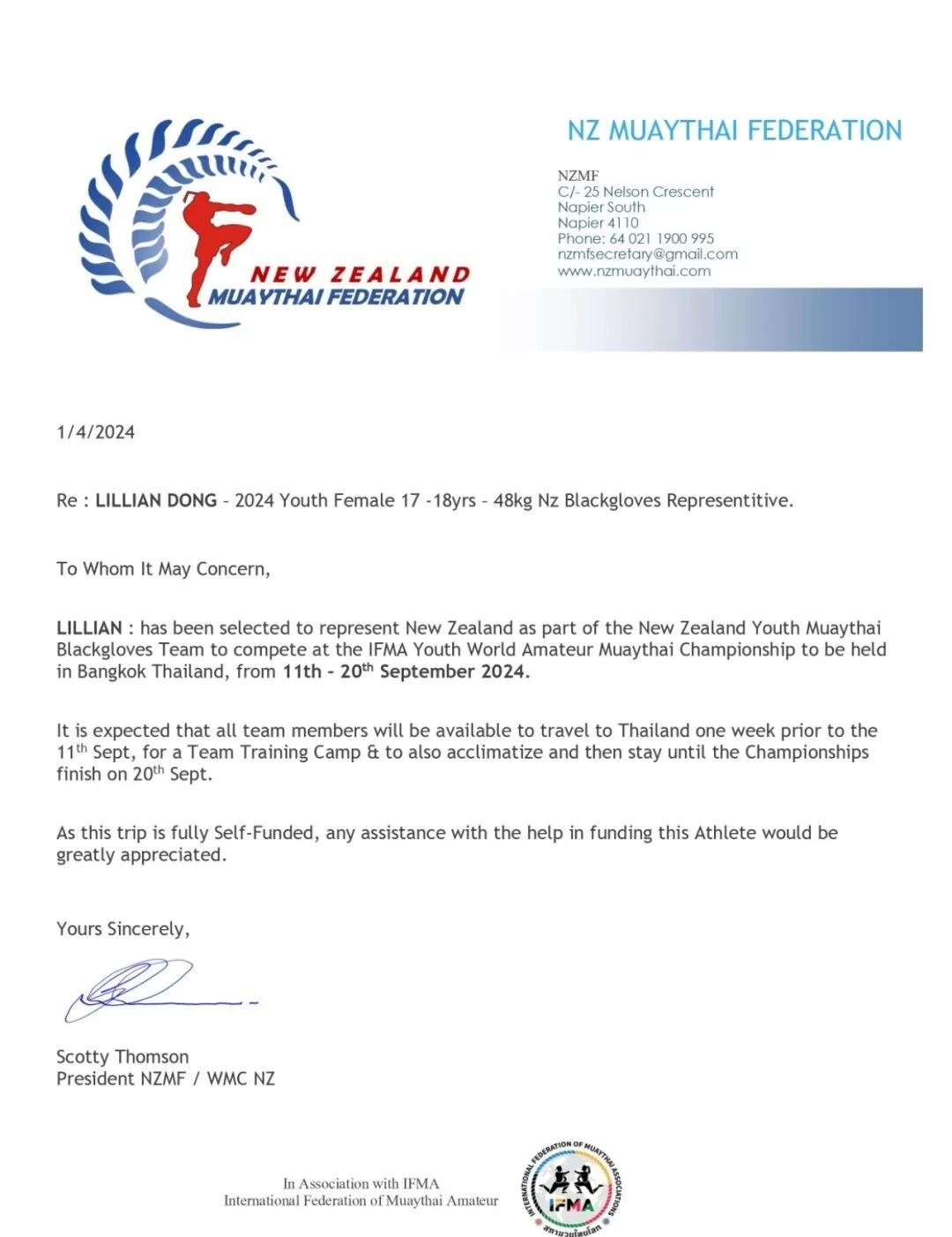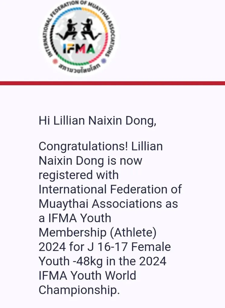 In April of this year, Lillian also received an invitation letter from the International Federation of Muaythai Associations (IFMA).
